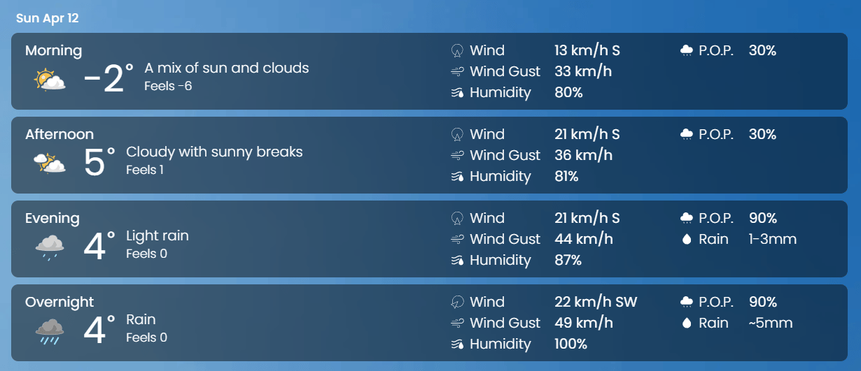 🌤 Weather – Mix of sun and cloud Low -2 High 5 Rain at Night