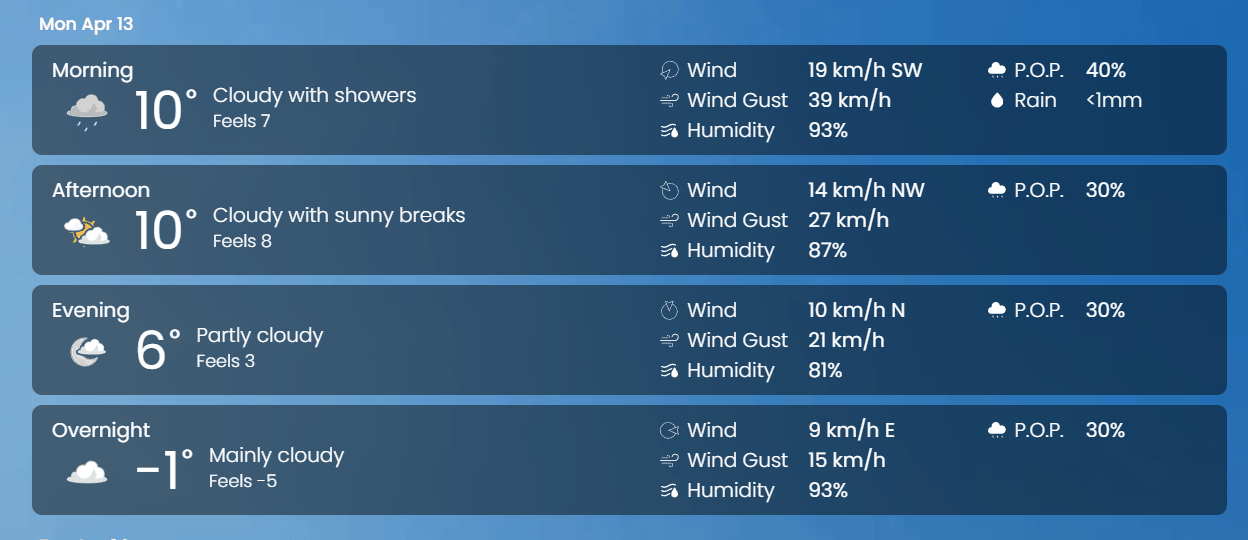 🌤 Weather – Mix of sun and cloud Low 1 High 10 Rain in the am